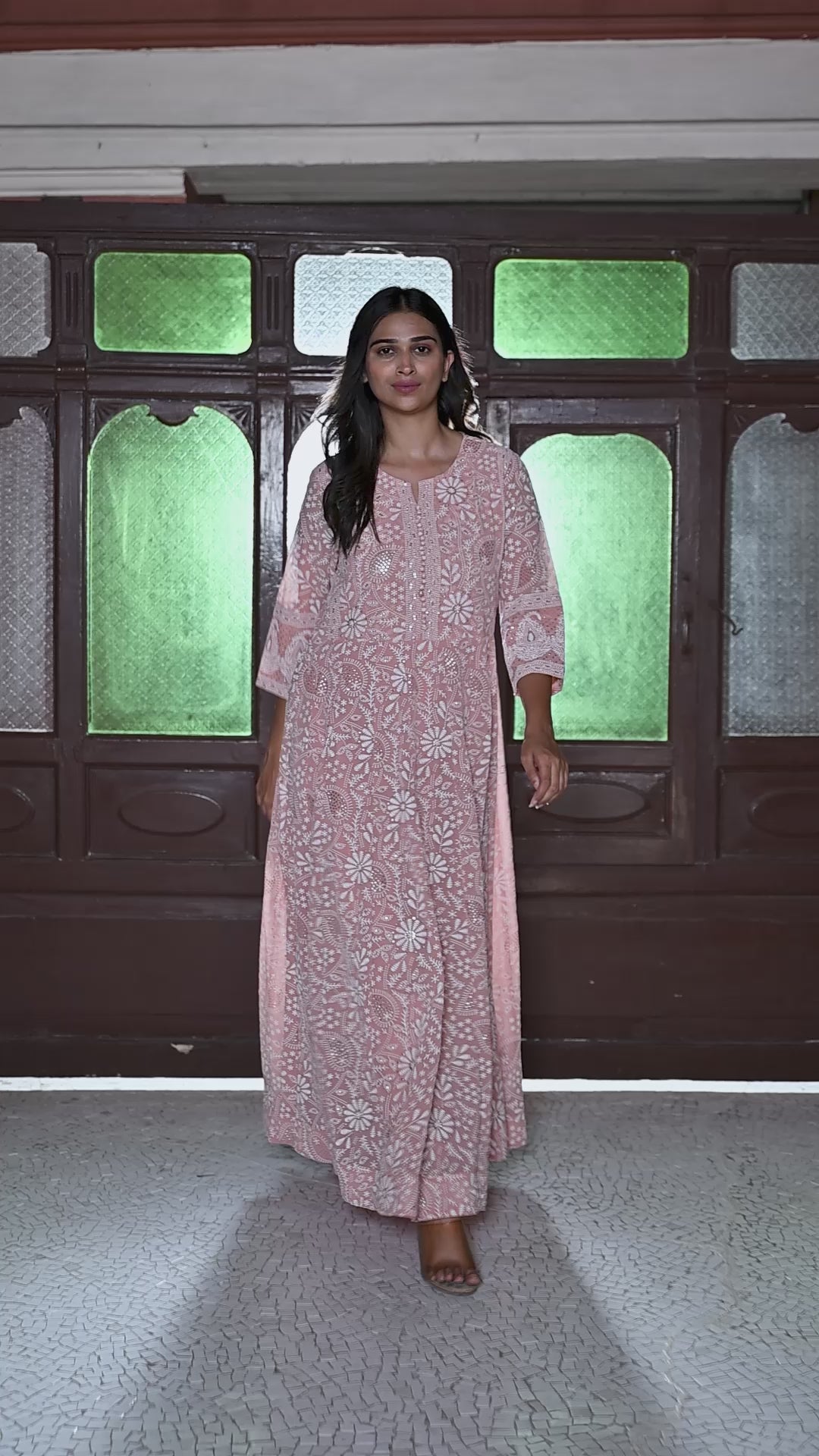 This all-over printed double-layer gown in a soft peach shade combines style with comfort for versatile top wear. Crafted with attention to detail, its double-layer construction offers a graceful drape and subtle texture. Ideal for both casual and festive occasions, this gown enhances your wardrobe with elegant prints and a flattering fit, reflecting refined taste and expert craftsmanship.